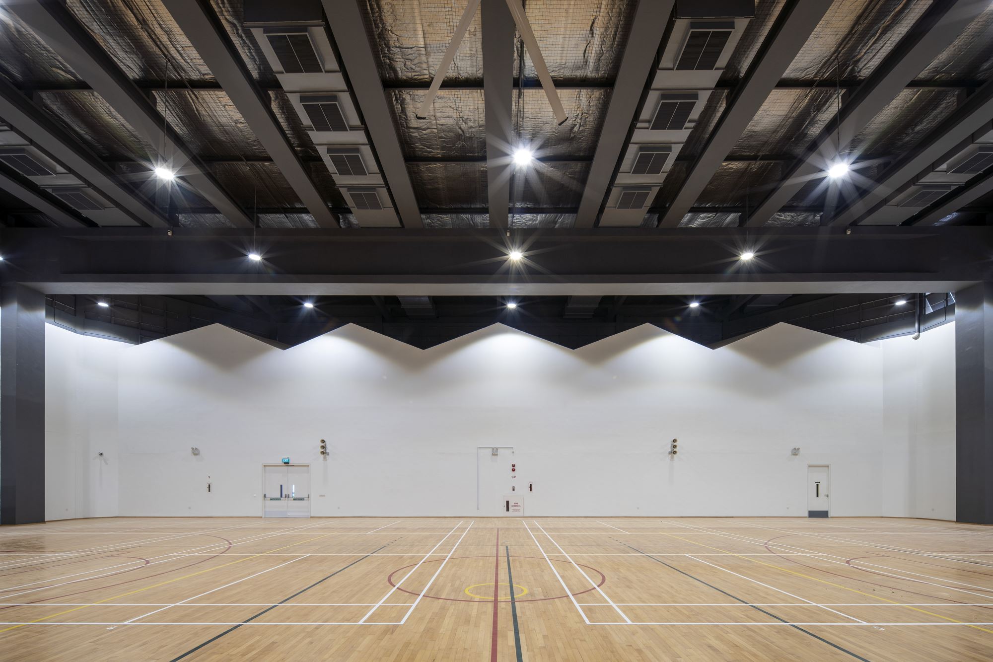 Indoor Hall: The indoor hall is used mostly for badminton games. We retained much of the hall but converted the stepped seating on the far side to provide space for 2 more badminton courts, a dance studio, and a café, 2023.(Darren Soh)