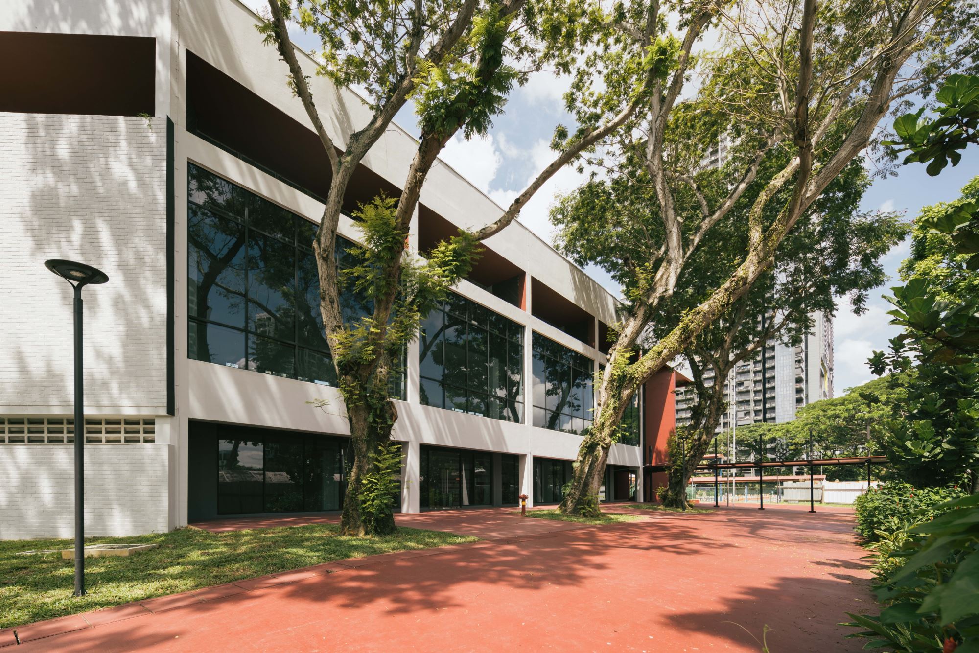 Gym Block Facade: The gym block façade integrates sun-shading concrete fins against the east and west sun with glazing always facing north and south. The solitary fin touching the corner is a result of this logic, 2023.(Darren Soh)
