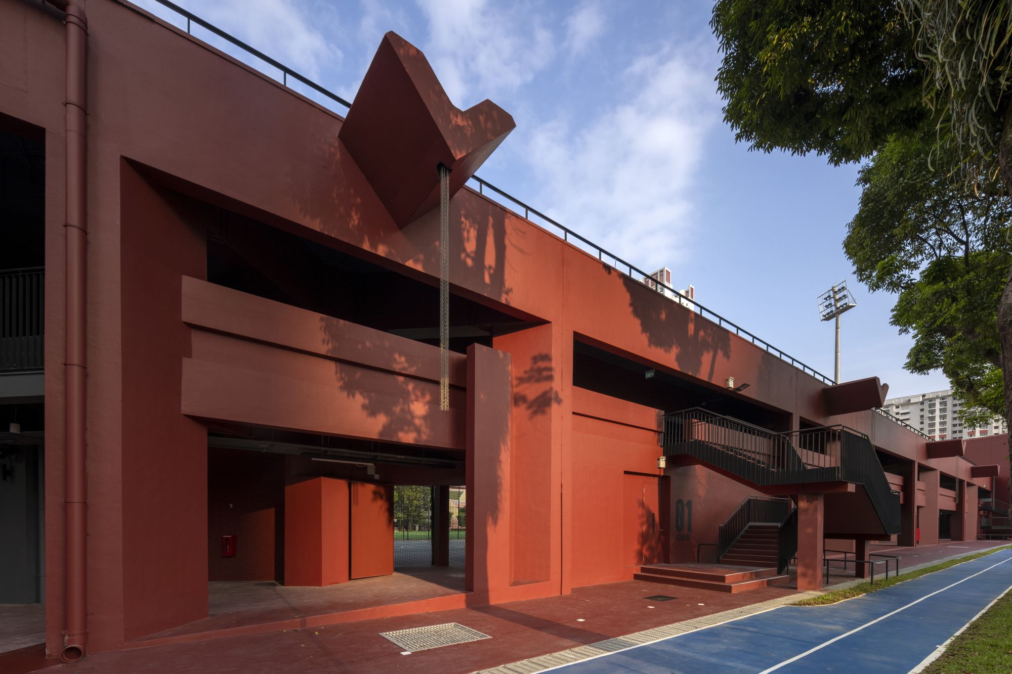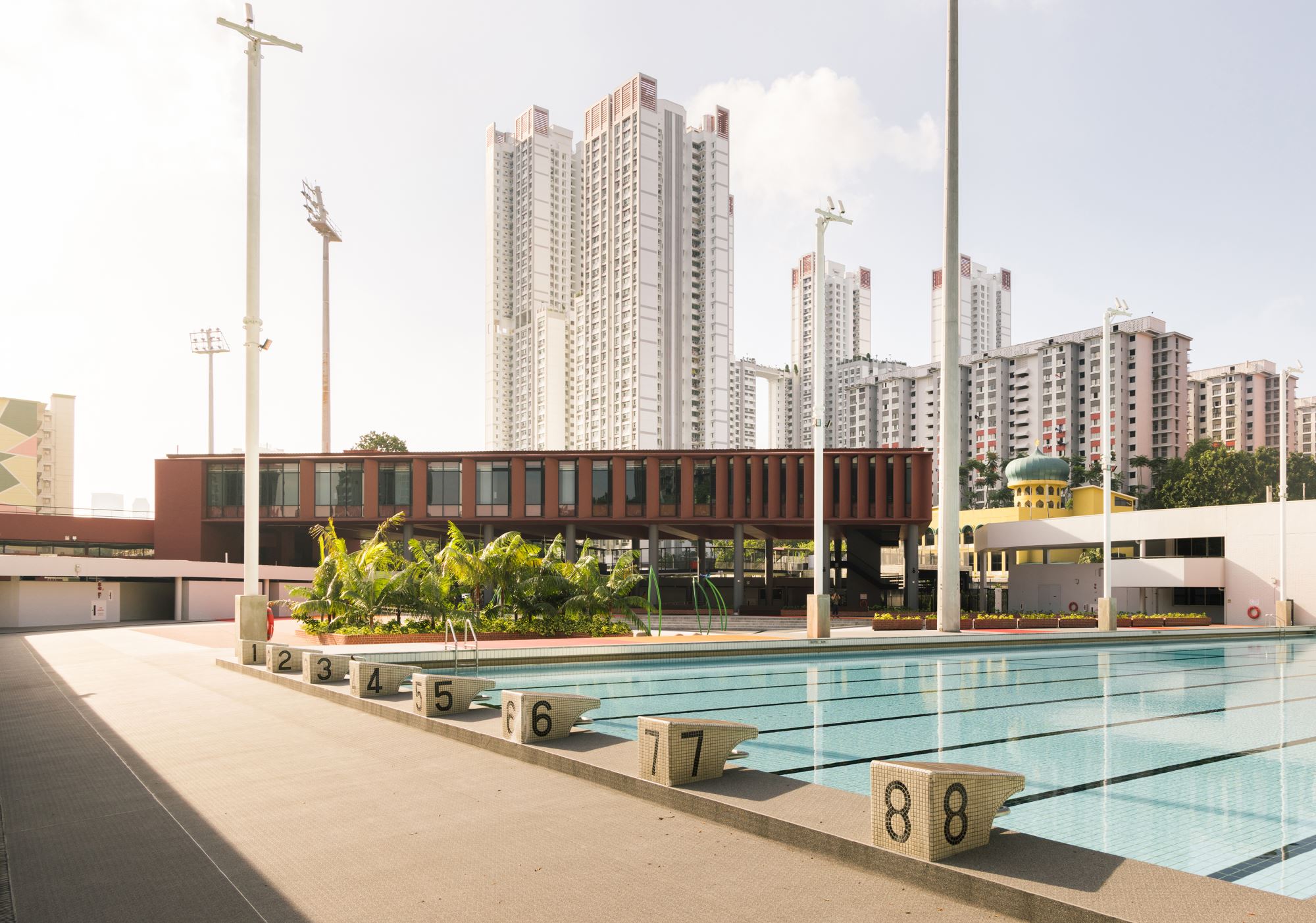 Tiong Bahru Road View: As a community space in a residential neighborhood, the new Delta Sport Centre is a horizontal counterpoint to the agglomeration of surrounding towers, 2023.(Finbarr Fallon)