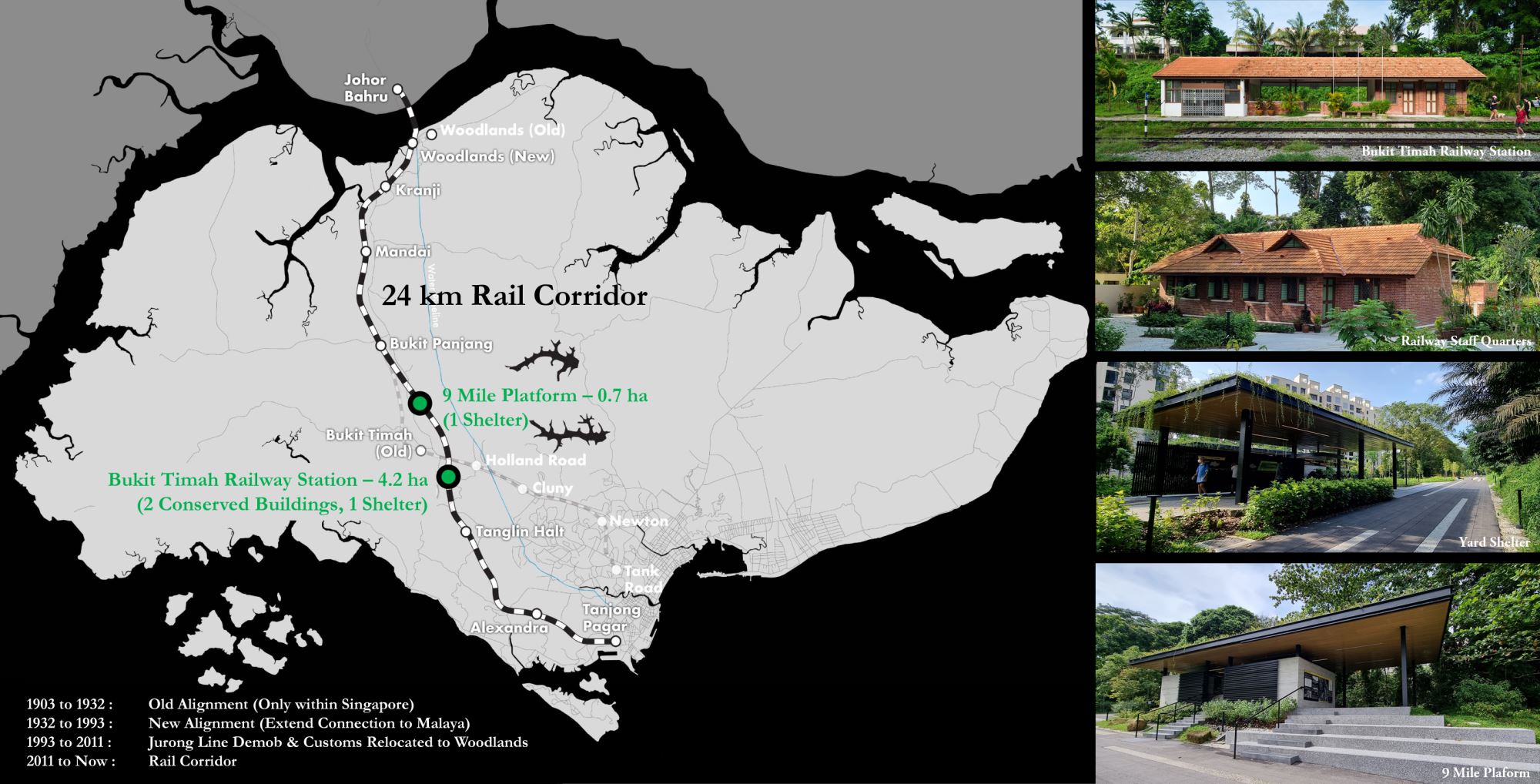 The Singapore Rail Corridor is a green, connected, inclusive, and endearing community space rich in heritage and nature reserve. As part of the restoration, works were carried out along the central region of the 24 km Rail Corridor, particularly at the Bukit Timah Railway Station and 9 Mile Platform at Jalan Asas.