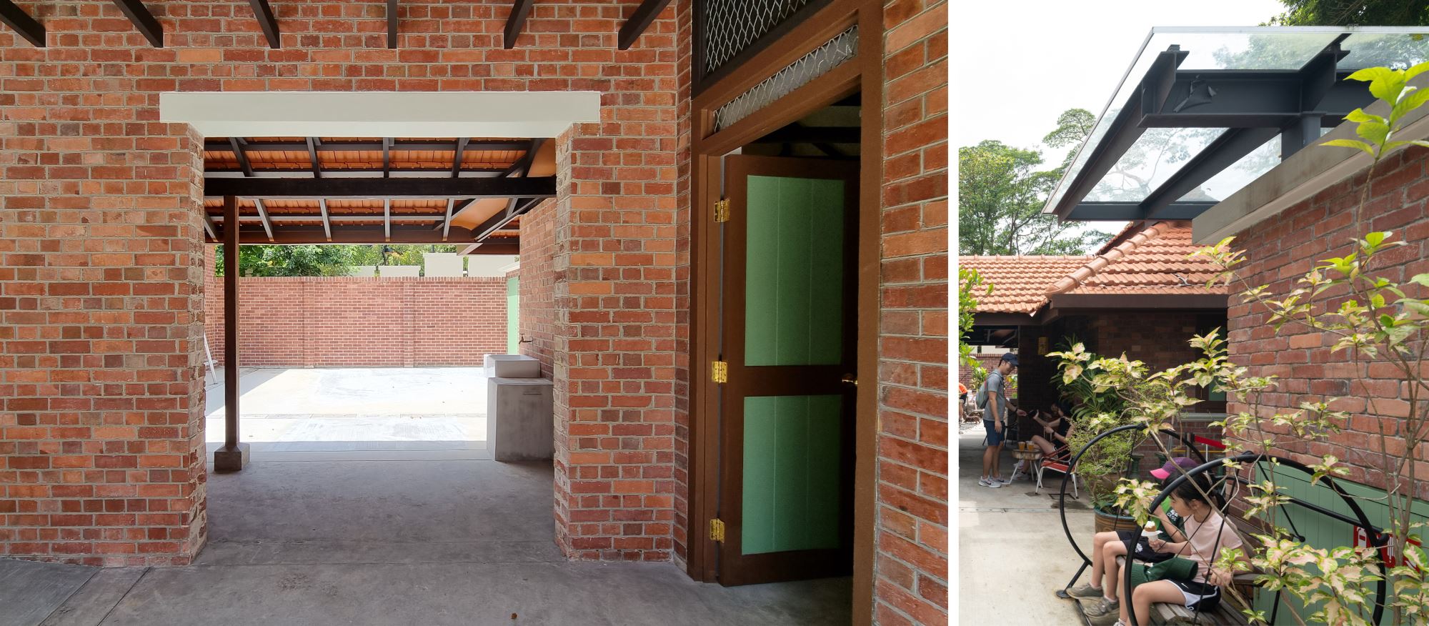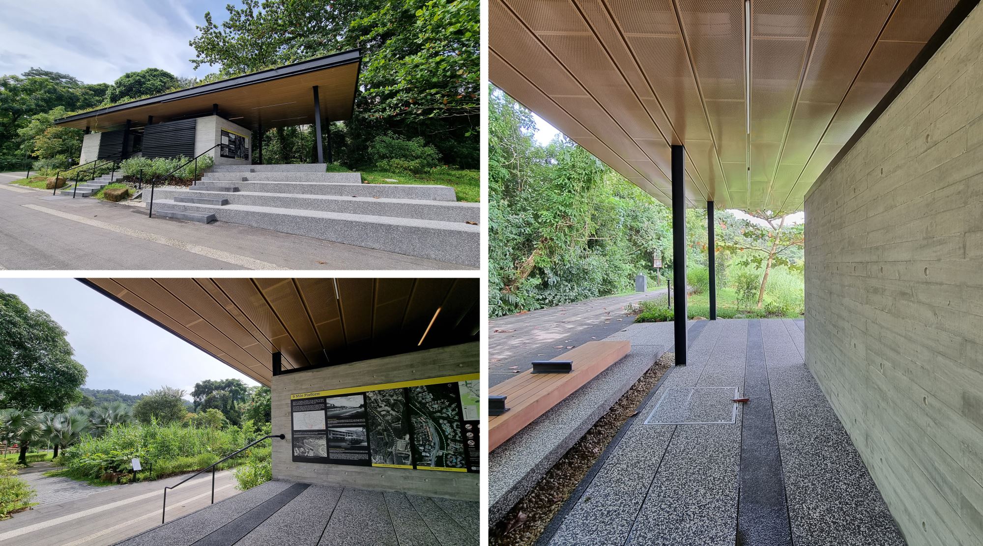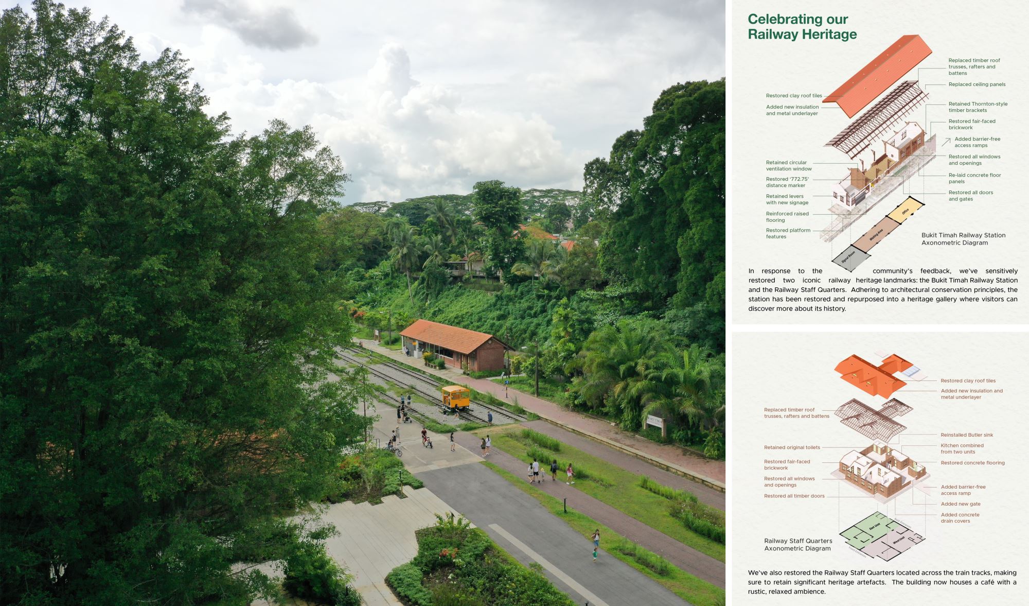 Both buildings have been fully restored today, nestled amongst the lush greenery of Bukit Timah Nature Reserve. The Station has been repurposed as a heritage gallery to showcase rail history, while the former Station Ticket Offce has been repurposed as a gathering base for the community to learn and share information on the greater Rail Corridor. The Quarters have been adaptively reused as an informal cafe and community-based photo gallery. The exterior green space has been enhanced as a delightful community node with quaint charm. A new lightweight standalone shelter with a lush green roof, in the spirit of kampong and rustic palette, was also introduced sensitively to house amenities, with another at Jalan Asas as "9 Mile Platform".