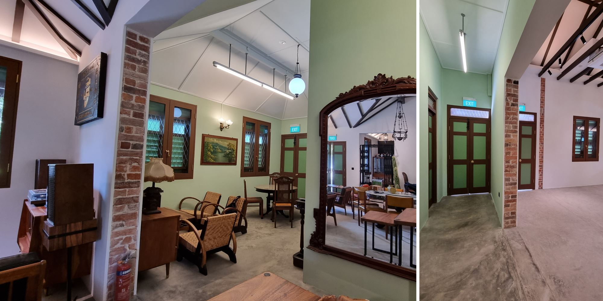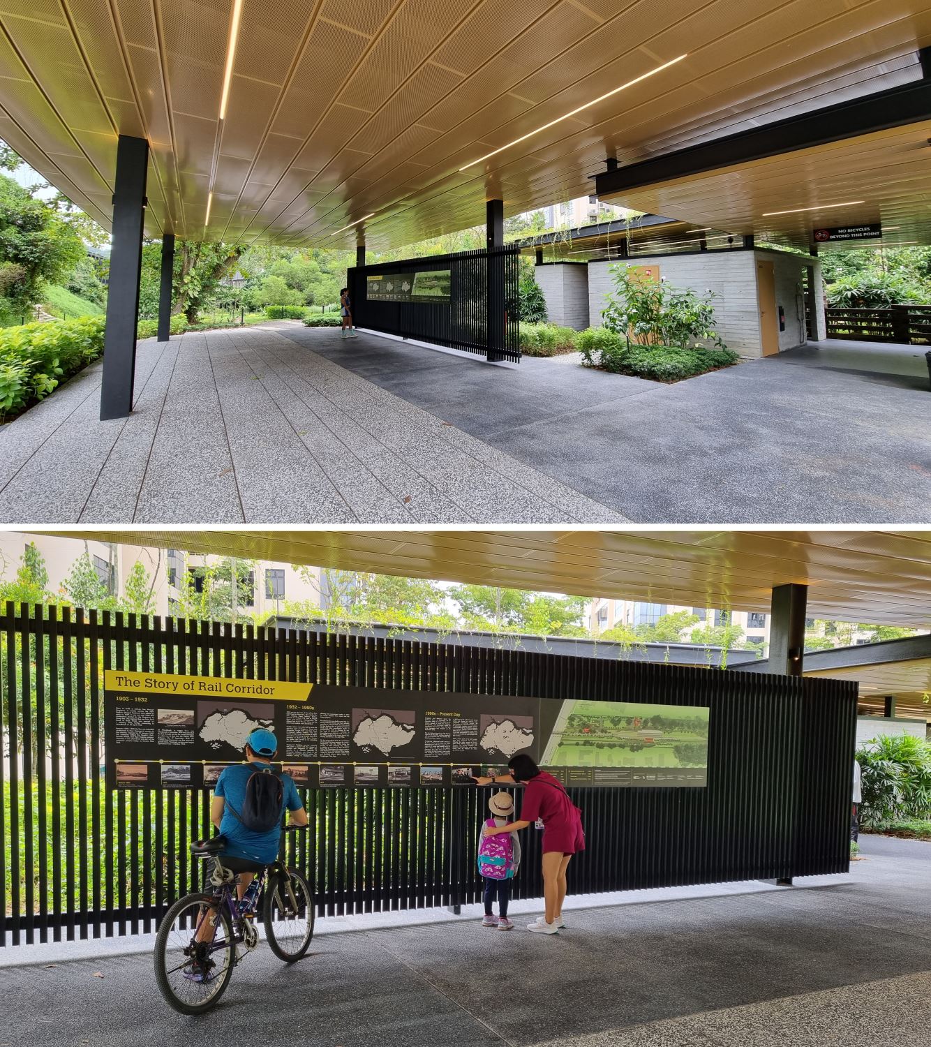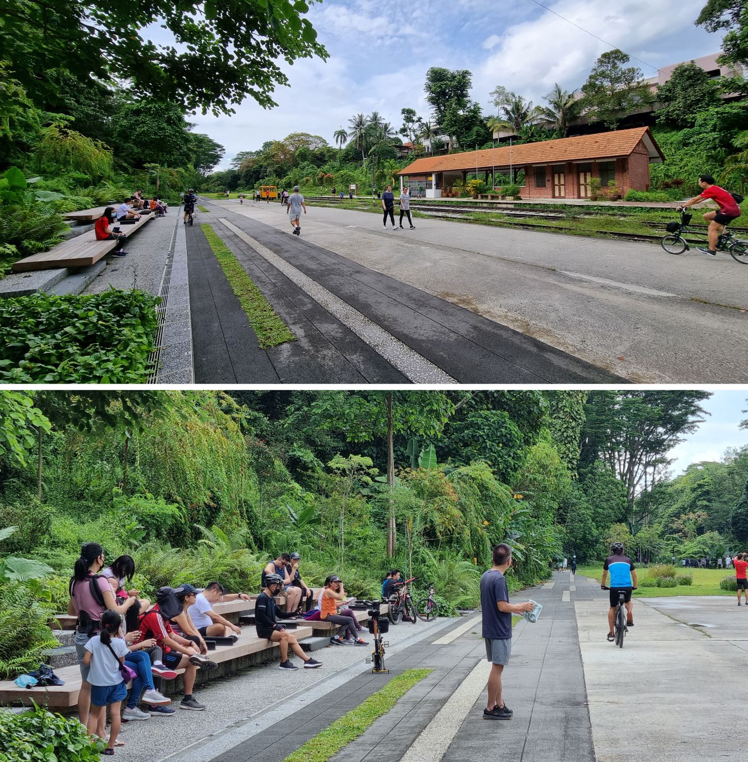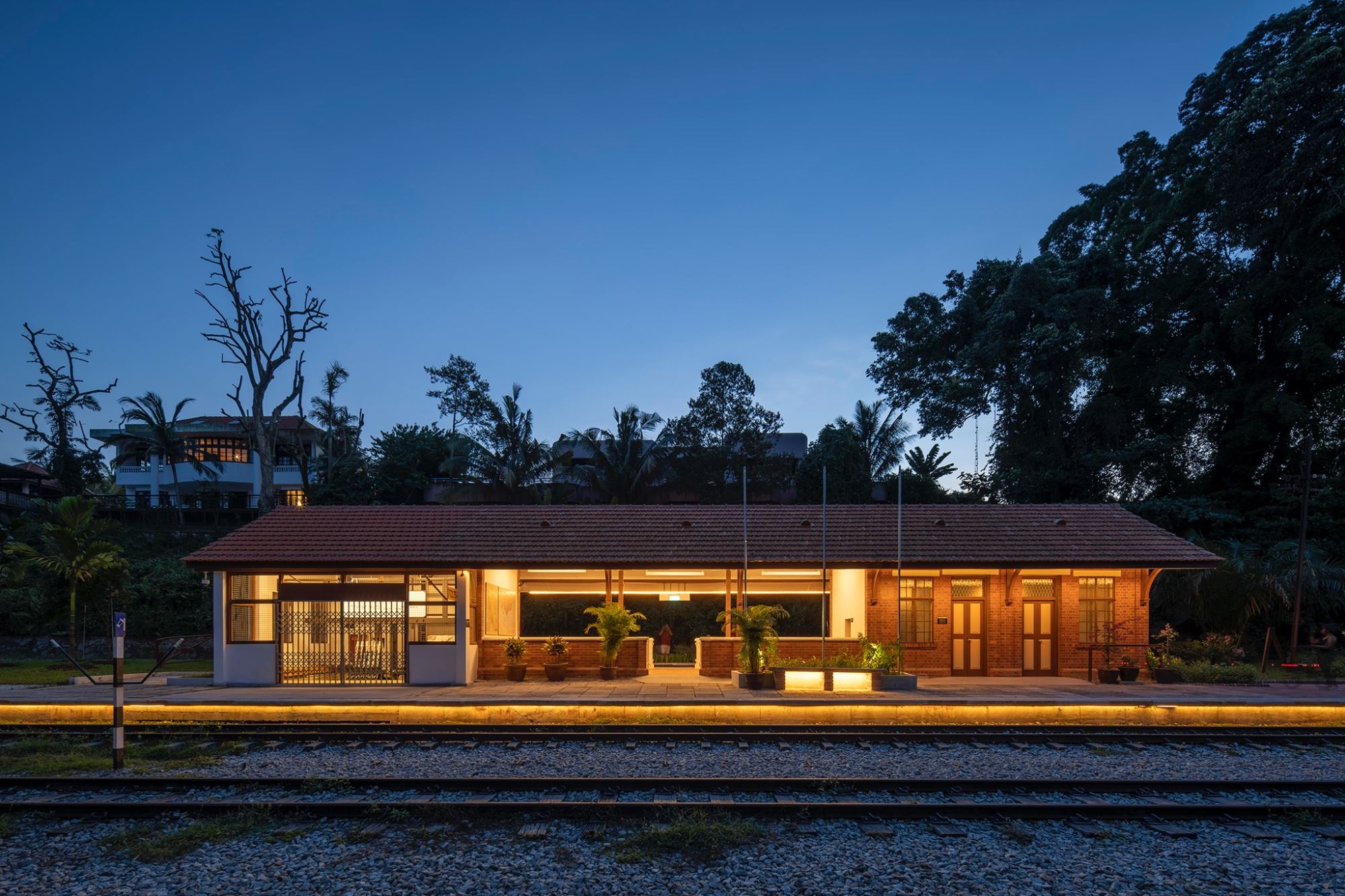 Both buildings have been fully restored today, nestled amongst the lush greenery of Bukit Timah Nature Reserve. The Station has been repurposed as a heritage gallery to showcase rail history, while the former Station Ticket Offce has been repurposed as a gathering base for the community to learn and share information on the greater Rail Corridor. The Quarters have been adaptively reused as an informal cafe and community-based photo gallery. The exterior green space has been enhanced as a delightful community node with quaint charm. A new lightweight standalone shelter with a lush green roof, in the spirit of kampong and rustic palette, was also introduced sensitively to house amenities, with another at Jalan Asas as "9 Mile Platform".