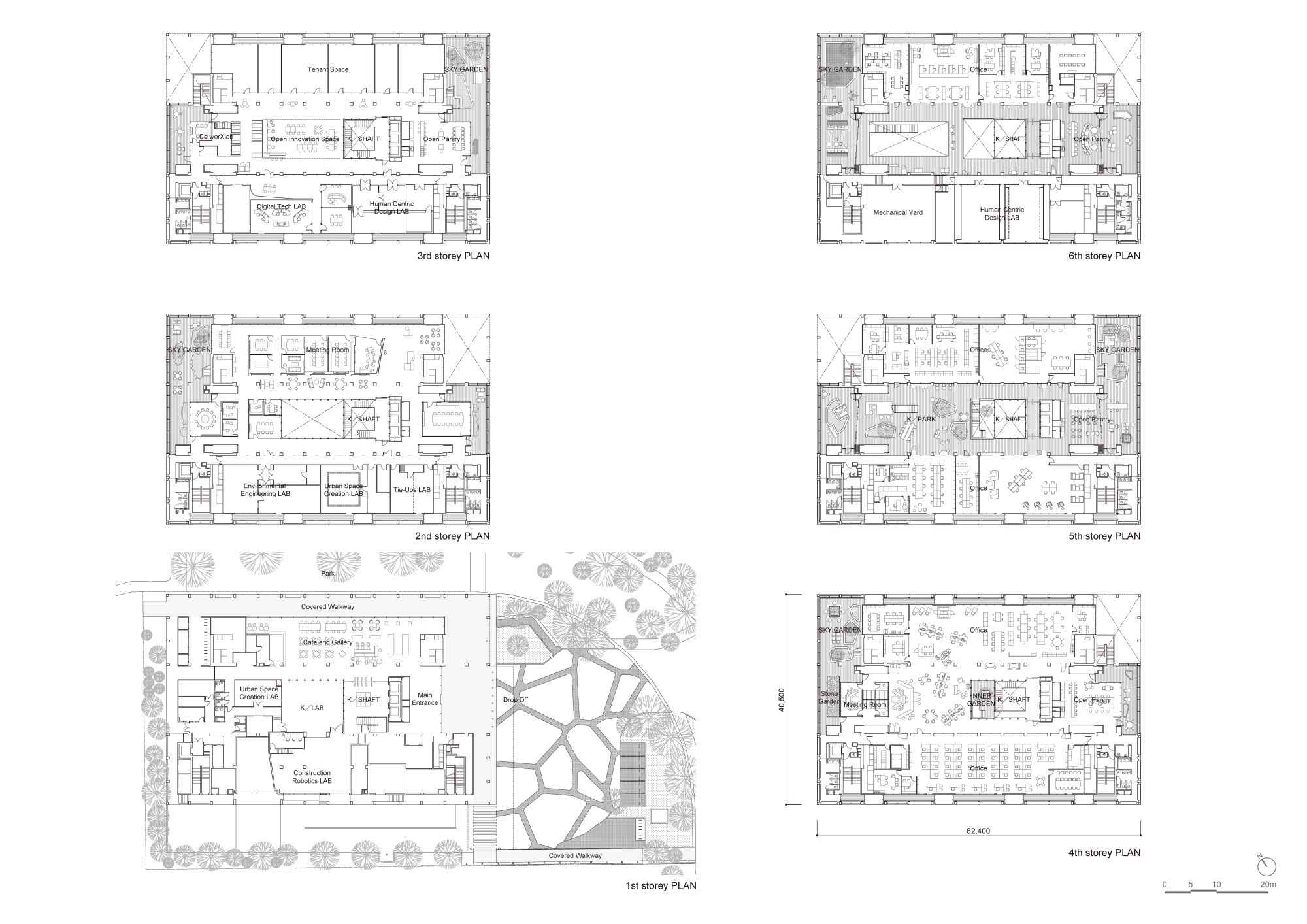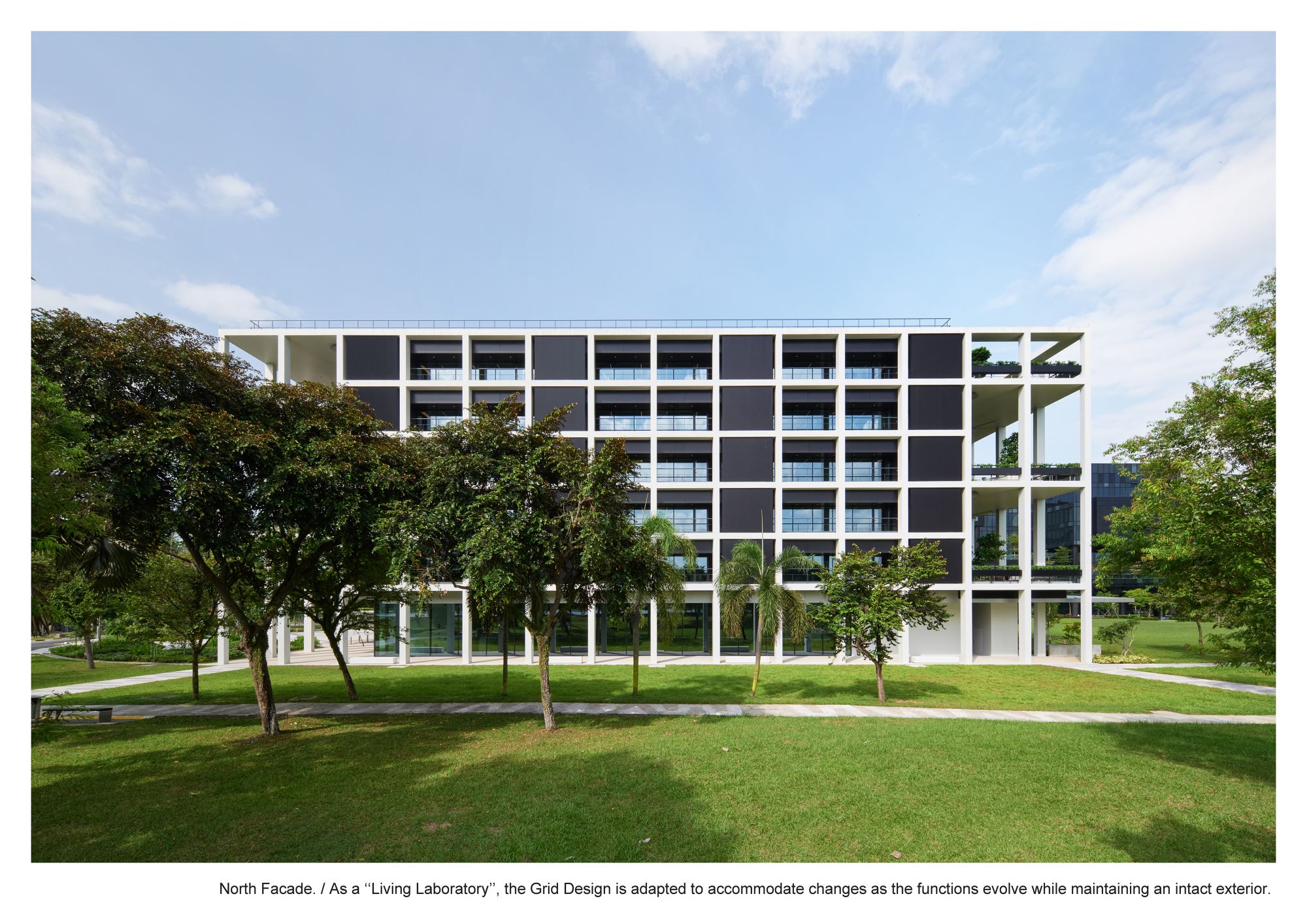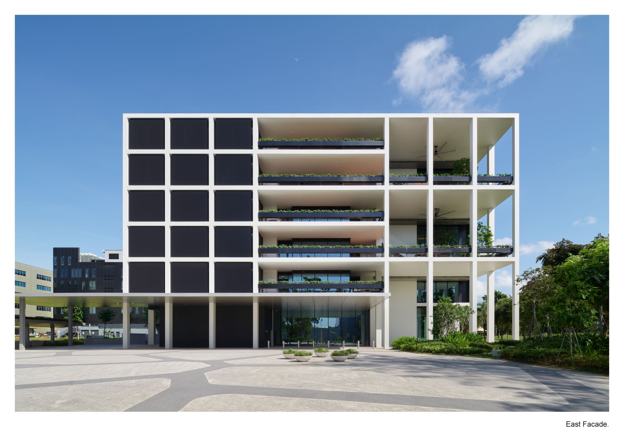 The GEAR is located in Changi Business Park and conforms to its Urban Design Guidelines and height constraints posed by its proximity to the airport. Each foor plan is divided into three equal-span zones of 13.5m. K/SHAFT, a vertical light court that penetrates throughout the foors, is set in the middle zone with a gradual spiraling staircase. Offce and laboratory spaces are strategically located on the north and south zones, with a thorough skeleton-and-infll concept that incorporates balconies and exposed structural frames along the entire perimeter. This allows a fexible deployment of space and accommodates future changes in usage and occupancy.
