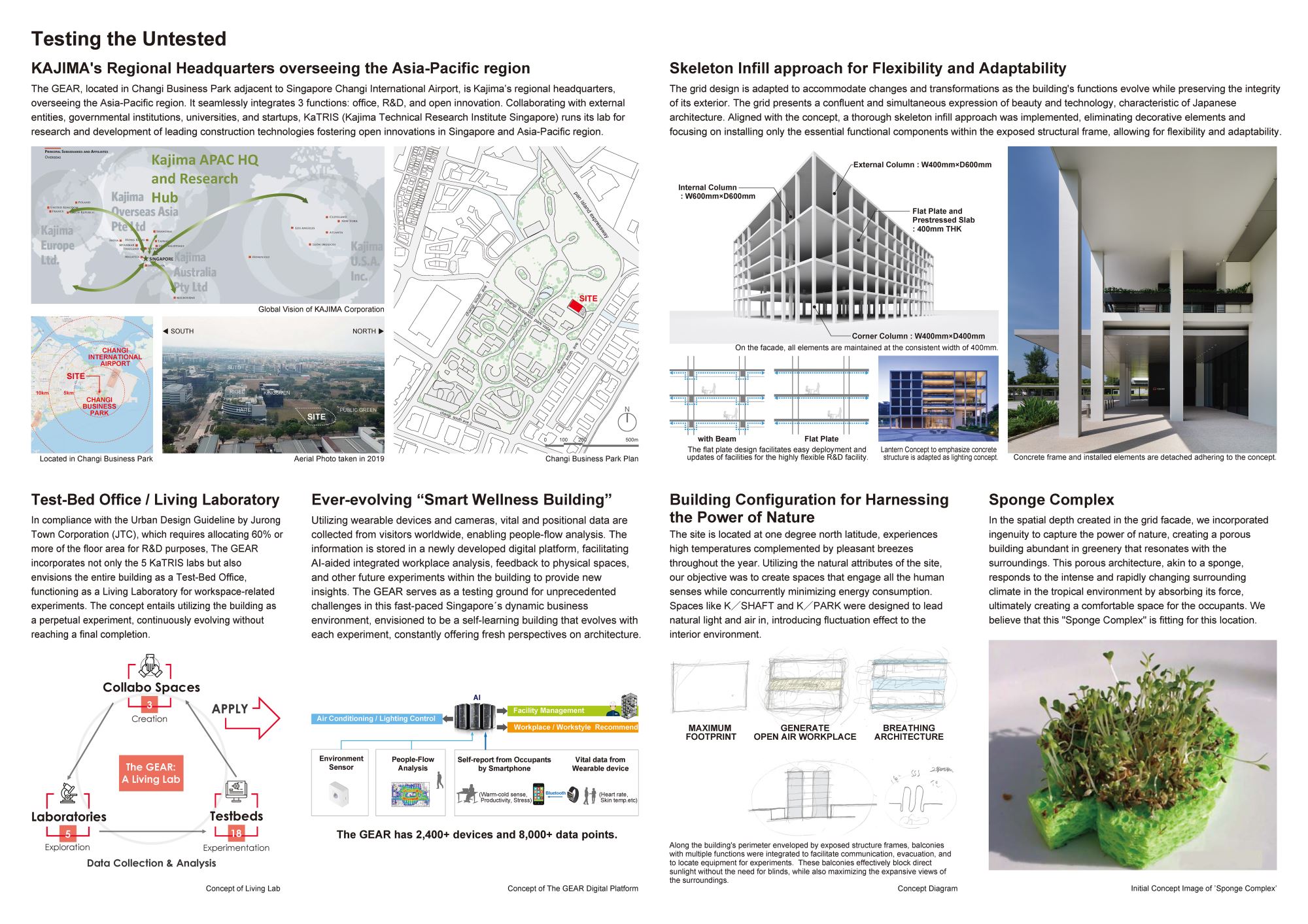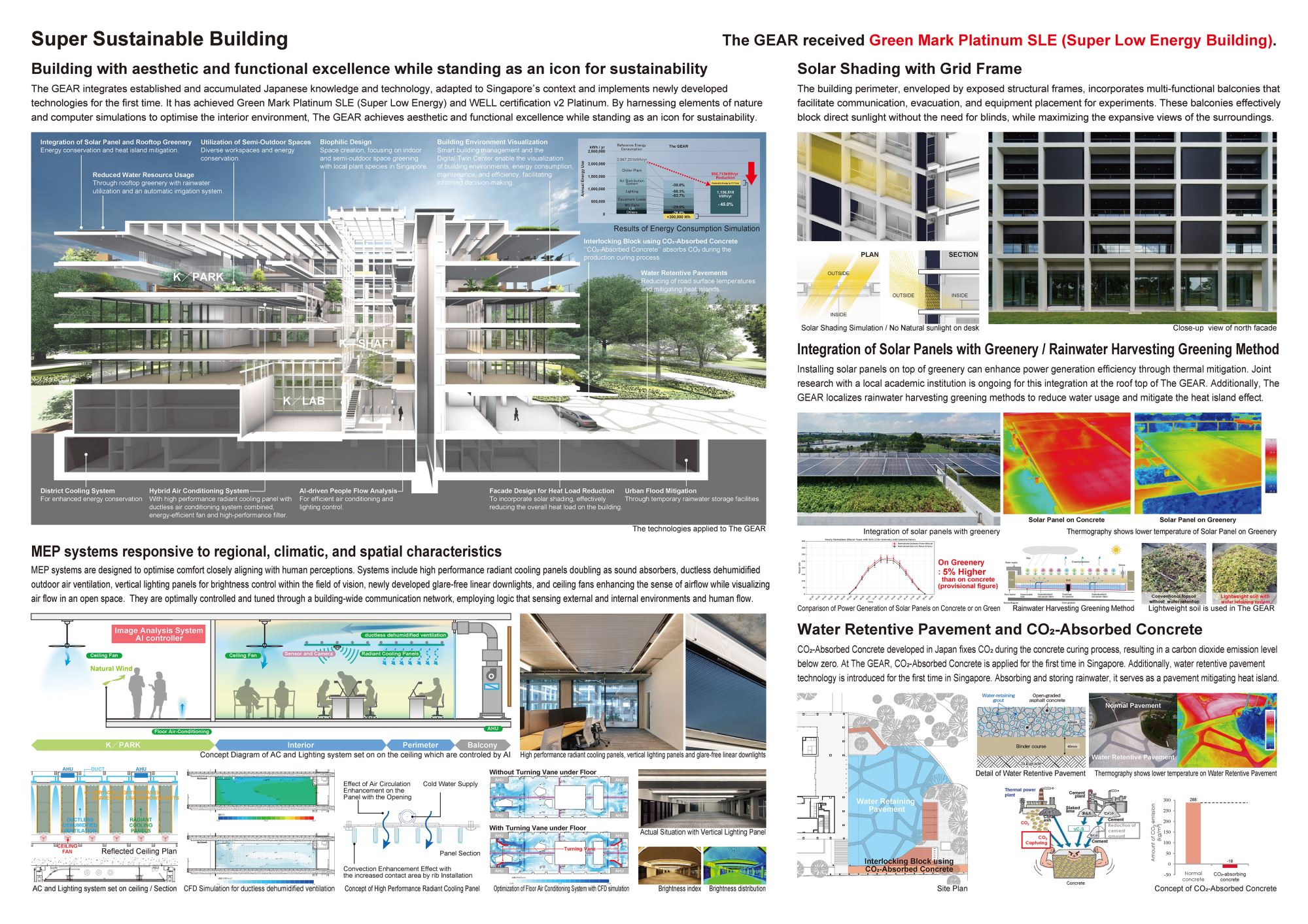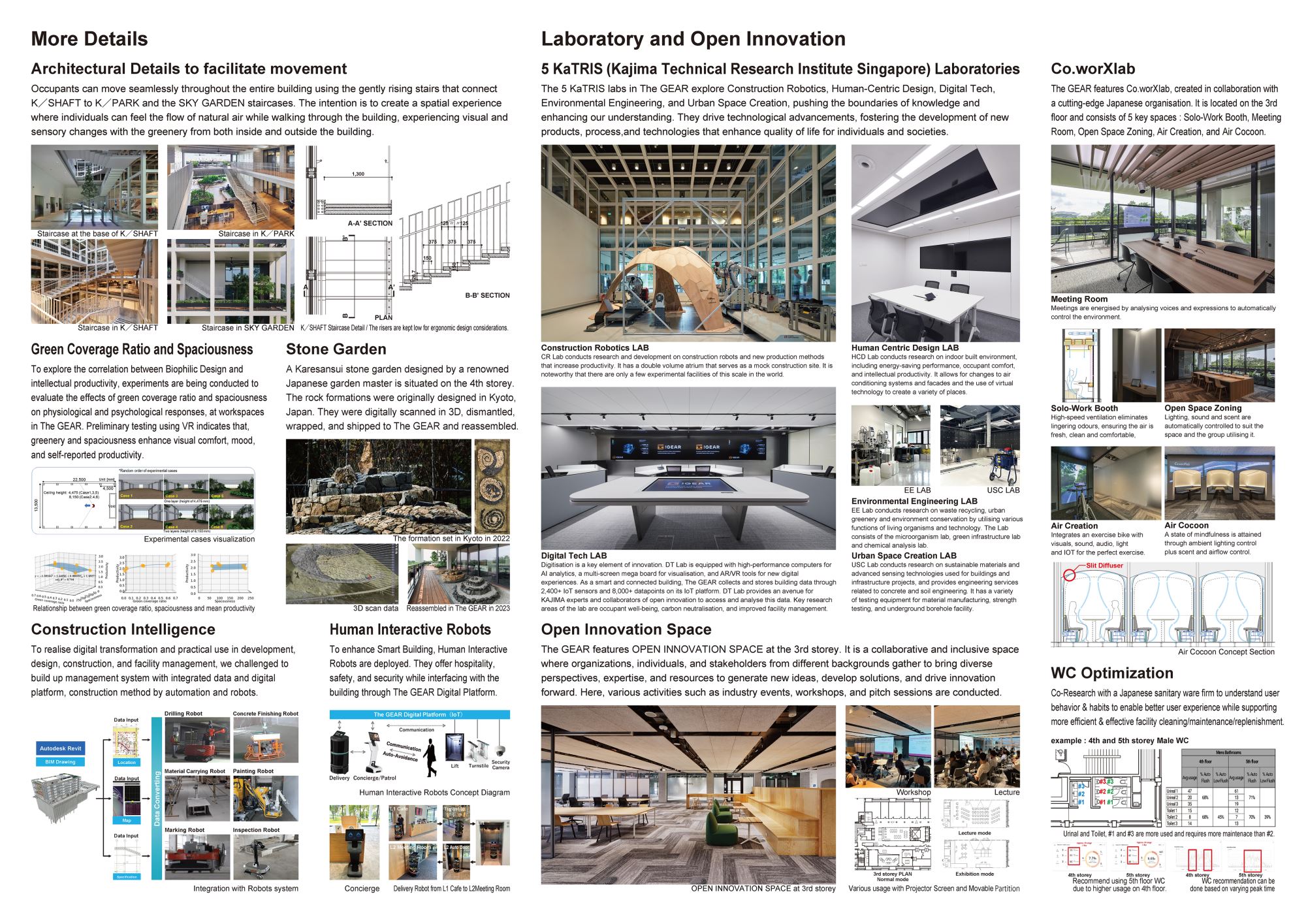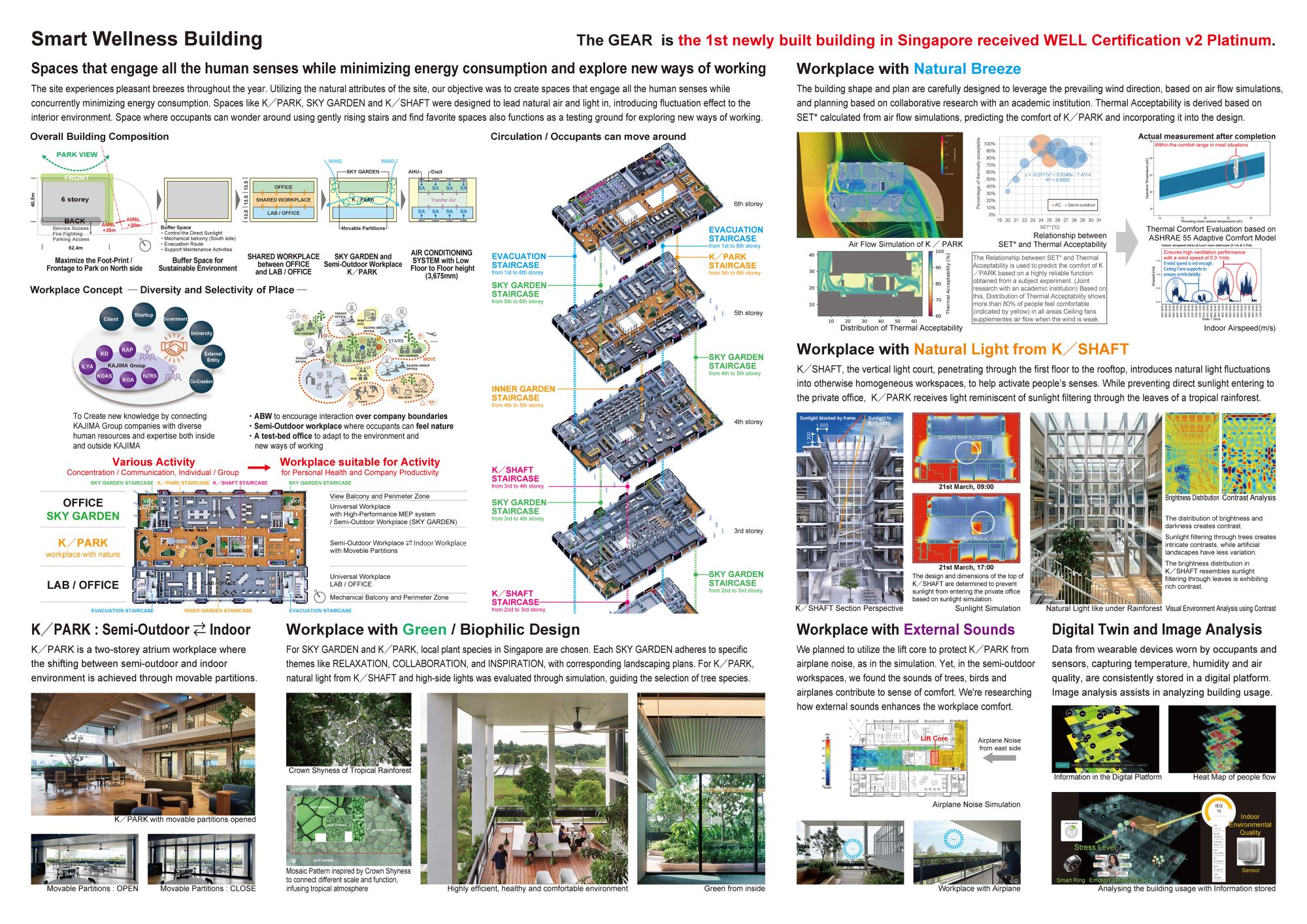 The GEAR is designed as Kajima's Asian regional headquarters, and seamlessly integrates three functions: offce, research and development (R&D), and open innovation. Here, Kajima Technical Research Institute Singapore (KaTRIS) runs its laboratories for leading construction technologies like robotics, and fosters open innovations in collaboration with external entities, governmental institutions, universities, and startups. The GEAR is designed to evolve as a smart wellness building that envisions the future of the environment, city, and living. It is a living laboratory for validating development results and collecting feedback.