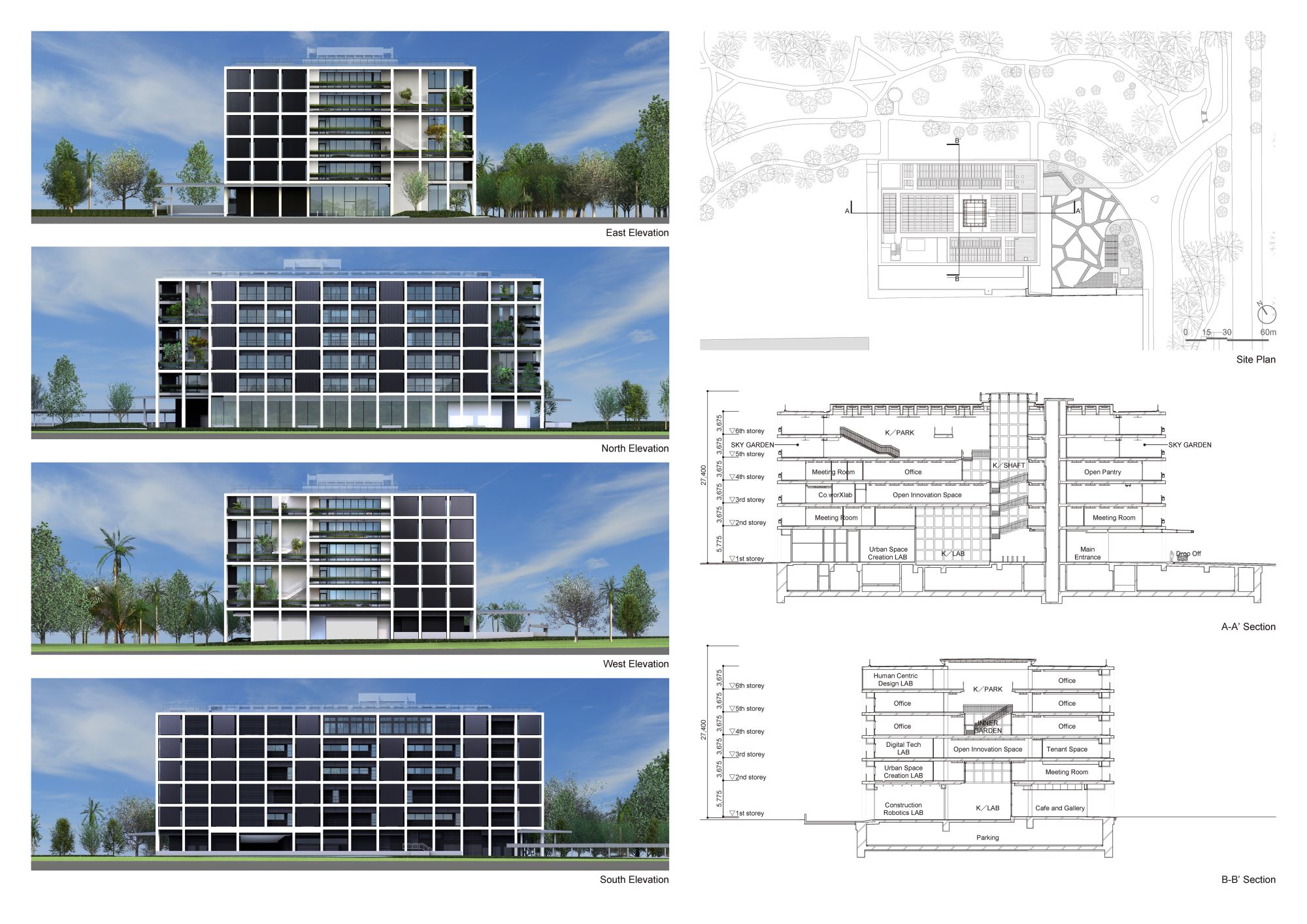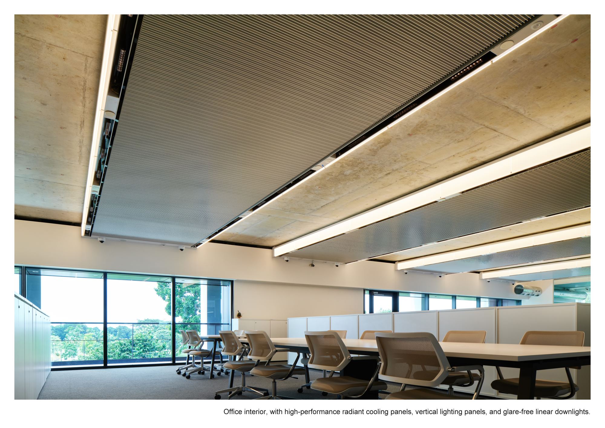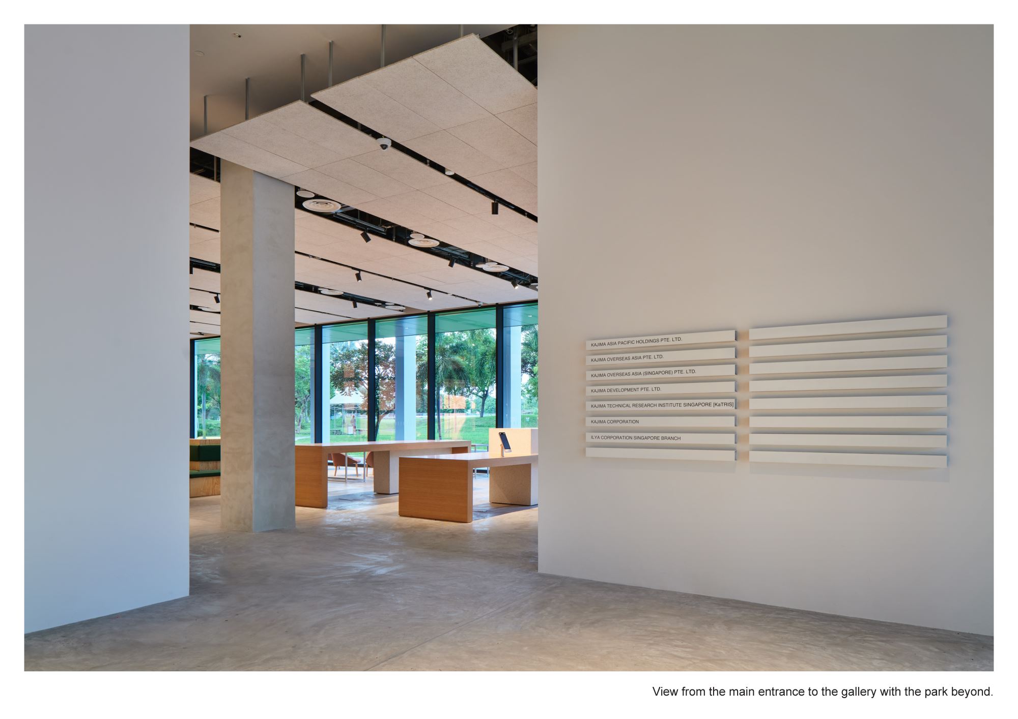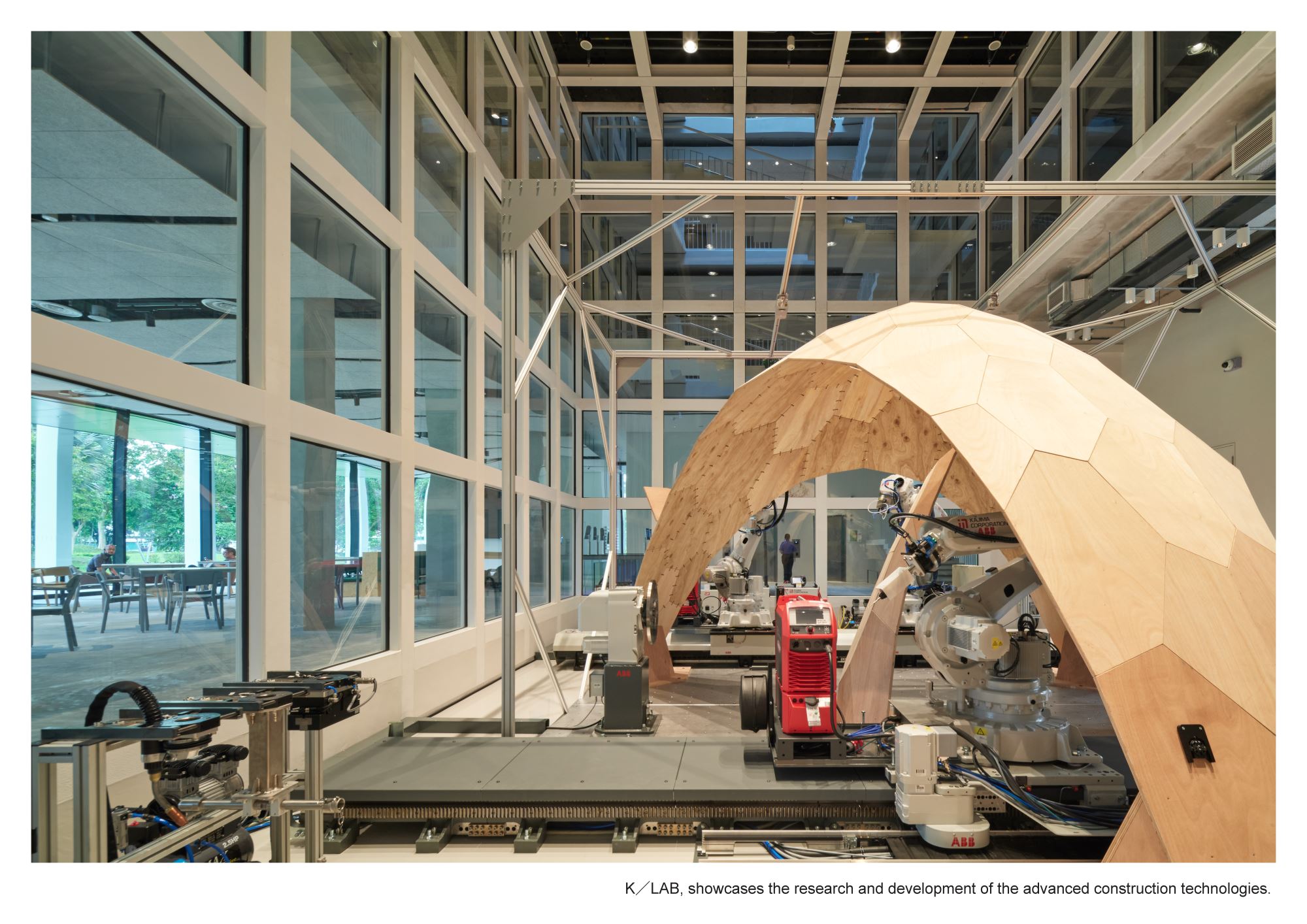 The GEAR is designed as Kajima's Asian regional headquarters, and seamlessly integrates three functions: offce, research and development (R&D), and open innovation. Here, Kajima Technical Research Institute Singapore (KaTRIS) runs its laboratories for leading construction technologies like robotics, and fosters open innovations in collaboration with external entities, governmental institutions, universities, and startups. The GEAR is designed to evolve as a smart wellness building that envisions the future of the environment, city, and living. It is a living laboratory for validating development results and collecting feedback.
