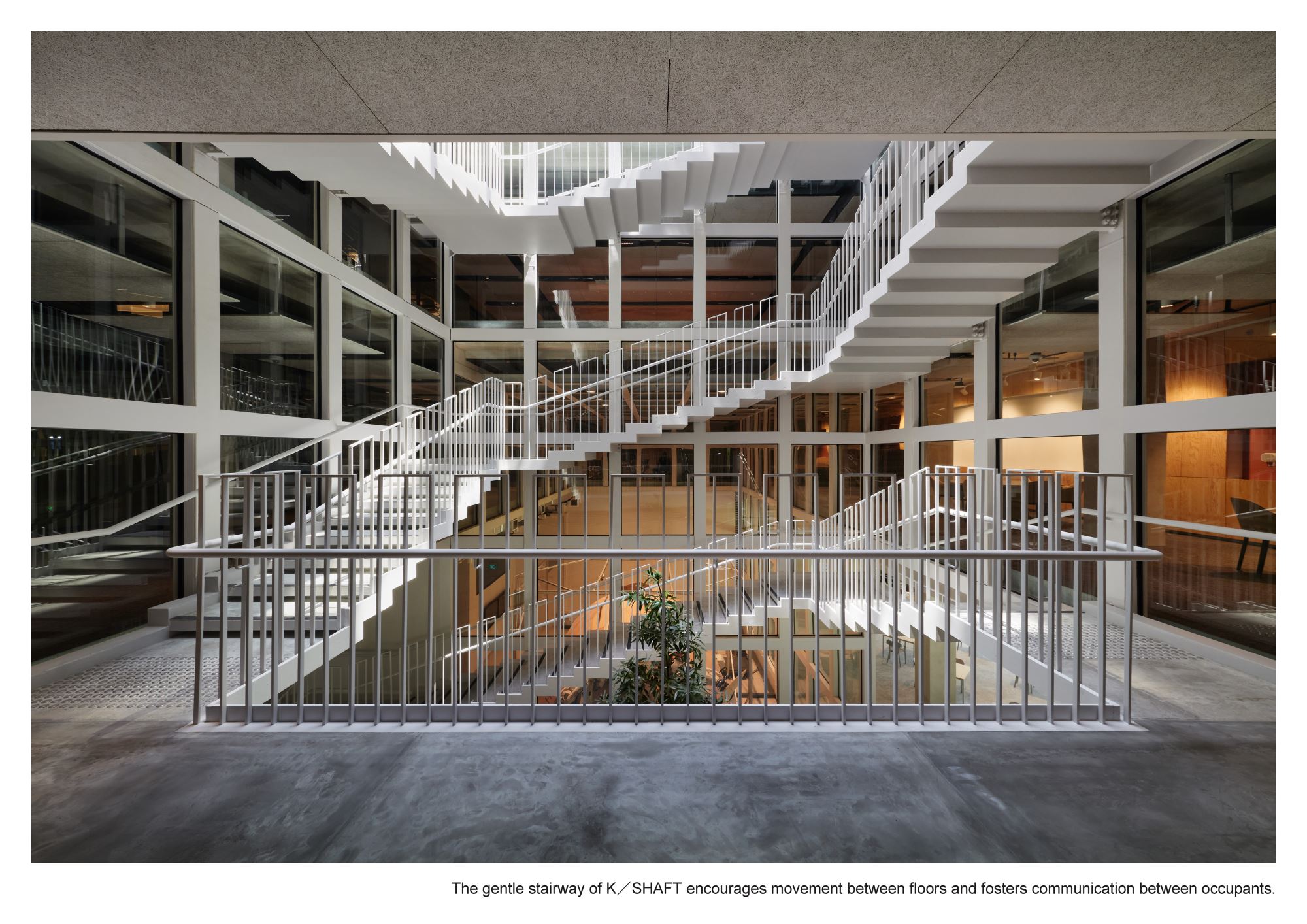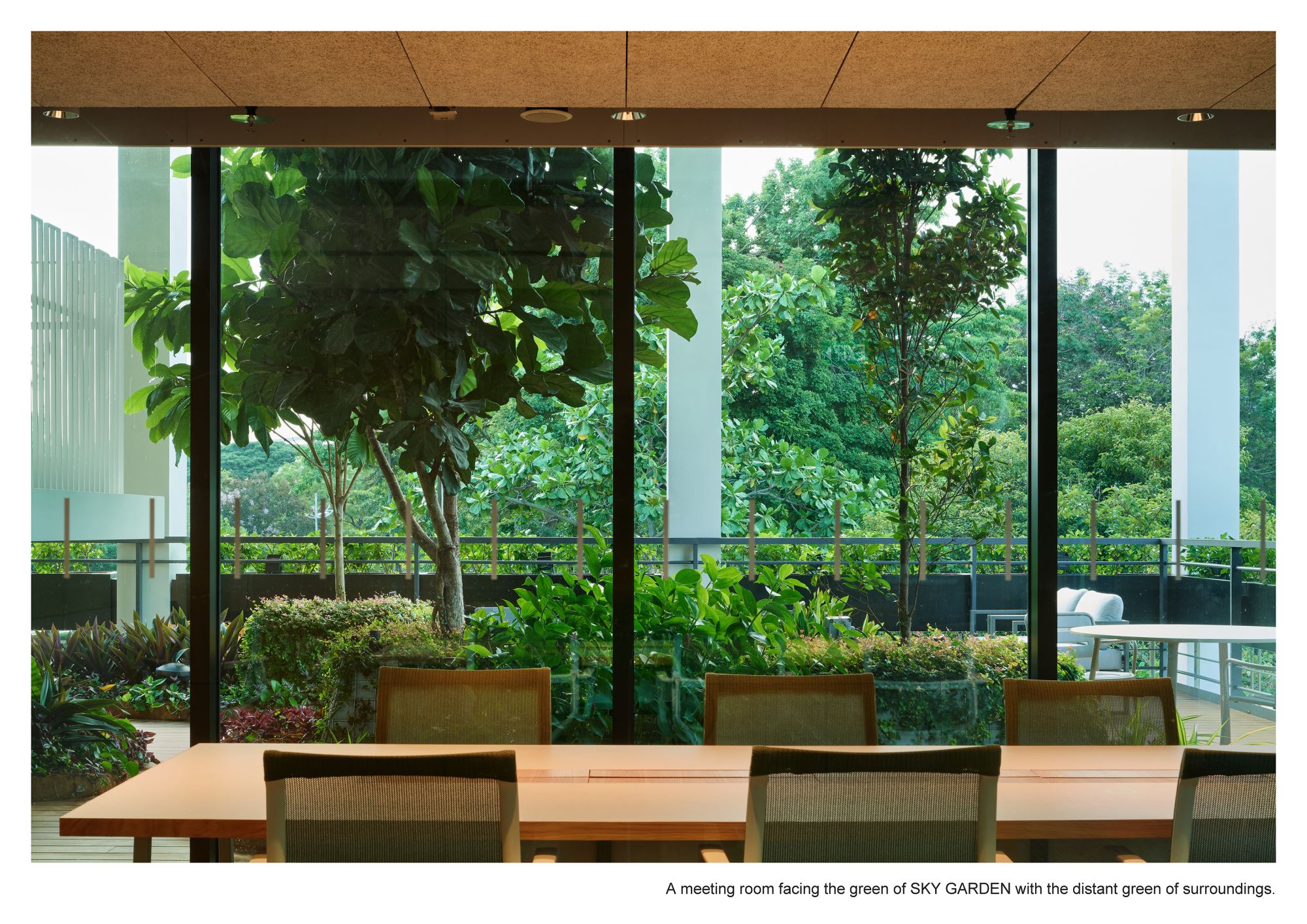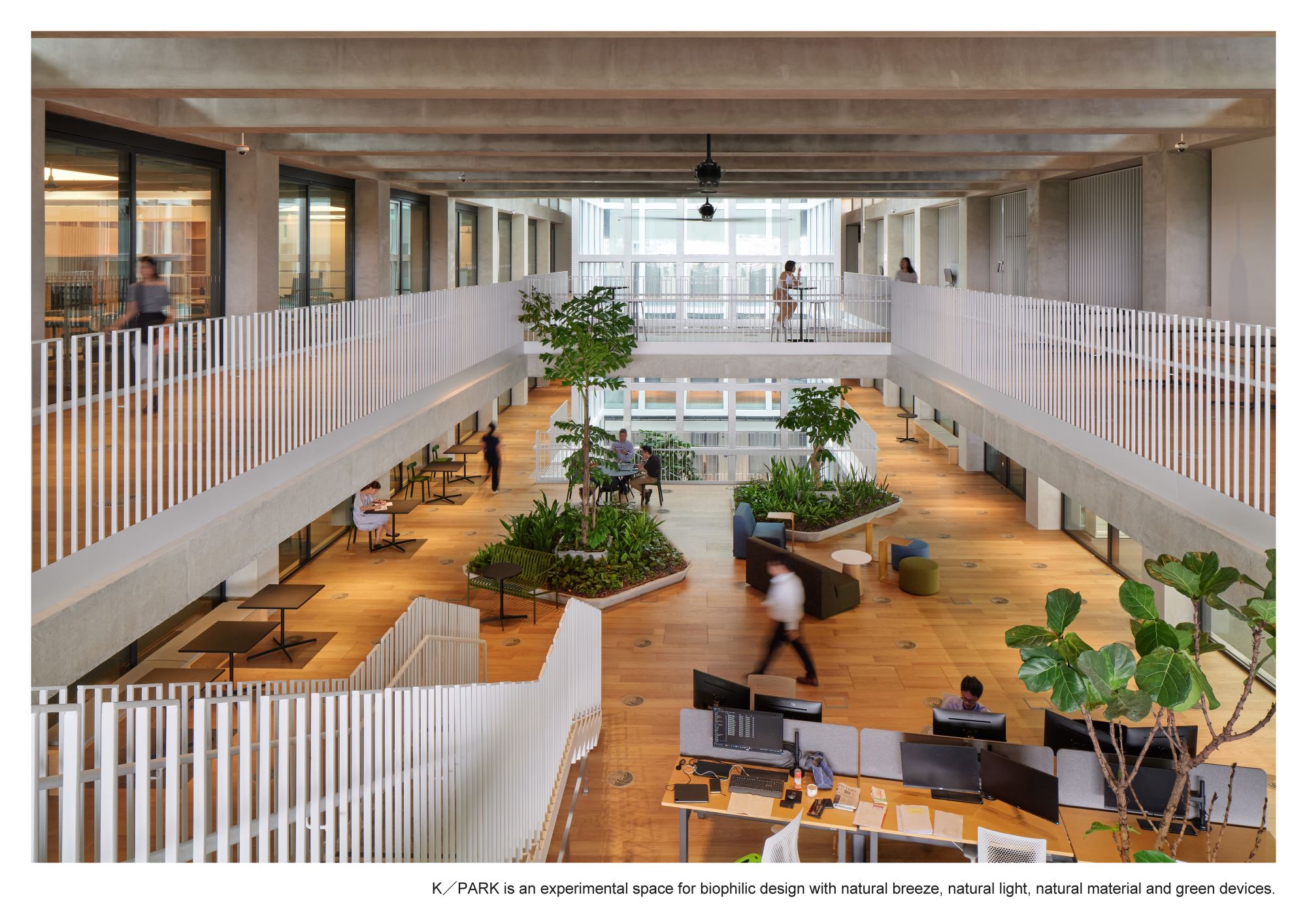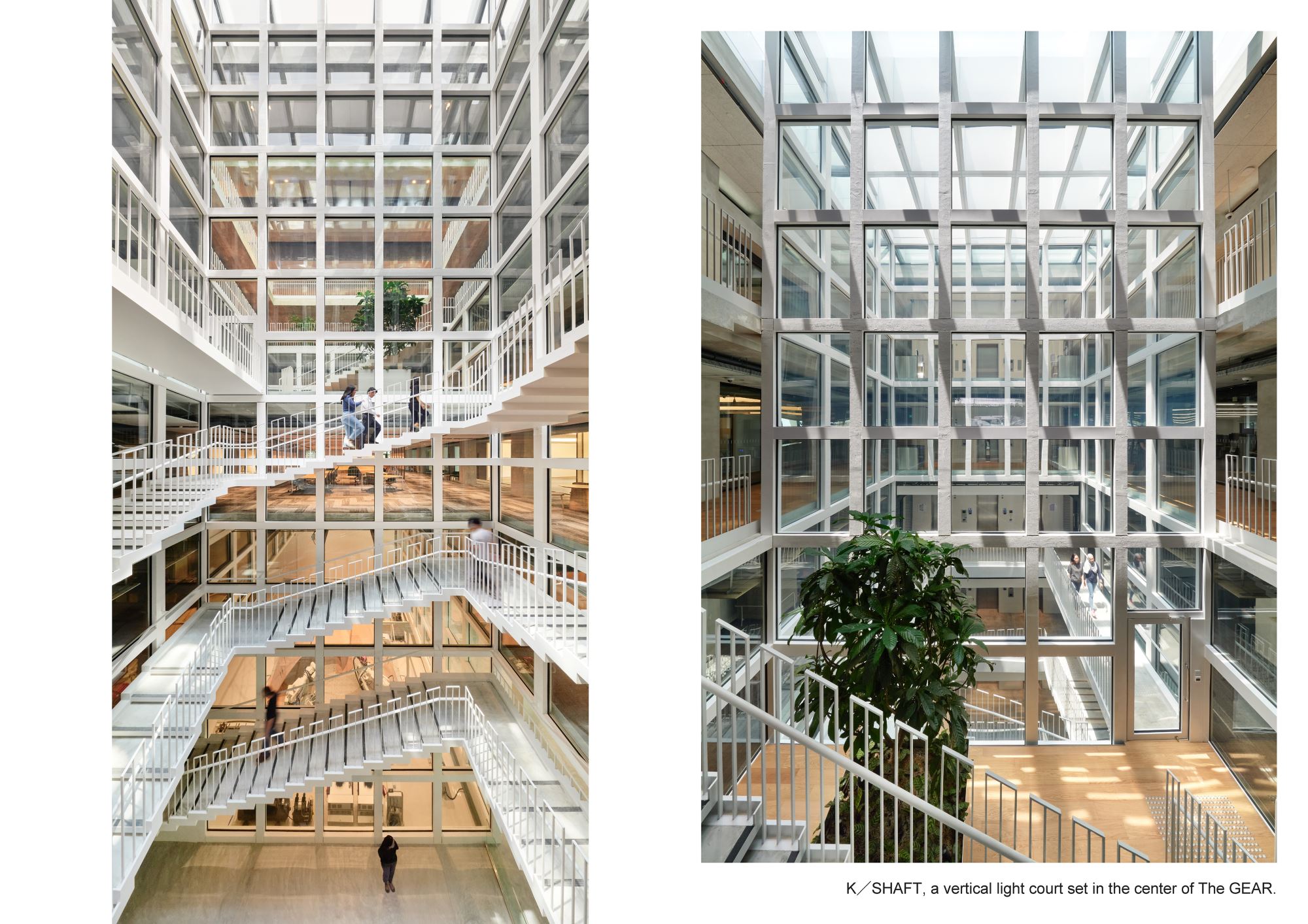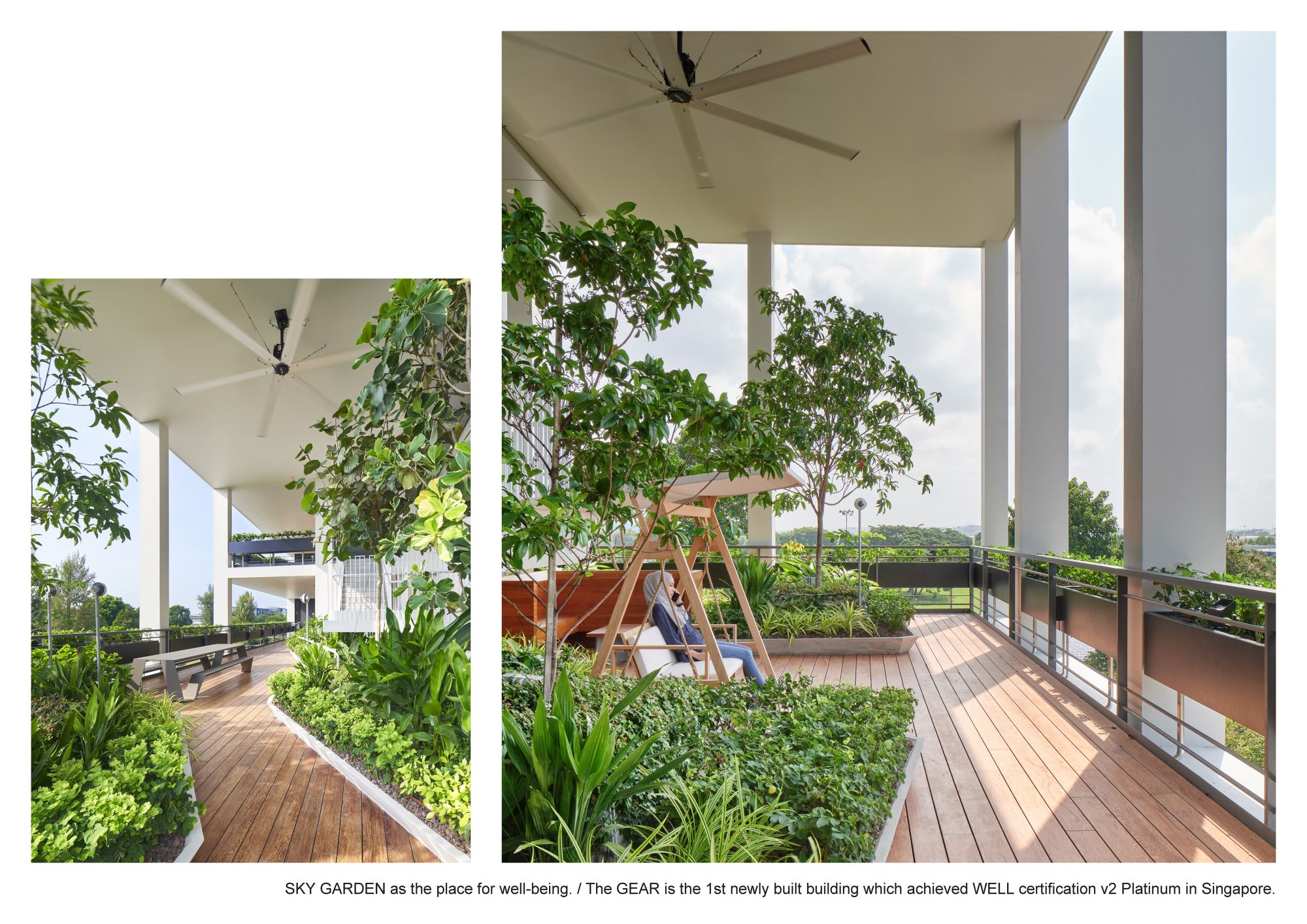 SKY GARDENS are featured on the north side facing a park. They are framed in deep grids that block direct sunlight, while visually embracing the greenery. K/PARK, a double-volume semi-outdoor working space, is on its ffth and sixth foors. This green-flled environment also acts as an experimental space for biophilic design. By employing elements of nature and computer simulations to optimize the interior environment, the building achieves aesthetic and functional excellence while standing as an icon for sustainability. The GEAR received BCA's Green Mark Platinum (SLE) and the frst WELL Certifcation v2 Platinum for the newly built structure.